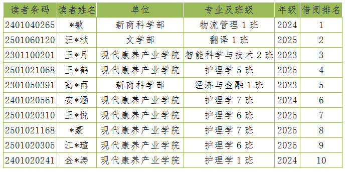 为建设书香校园,营造良好阅读氛围,激励学生多读书、读好书,图书馆将2025年1月1日-2025年12月31日期间外借纸本图书最多的前10位读者,授予“借阅之星”称号并予以奖励,具体名单如下表: